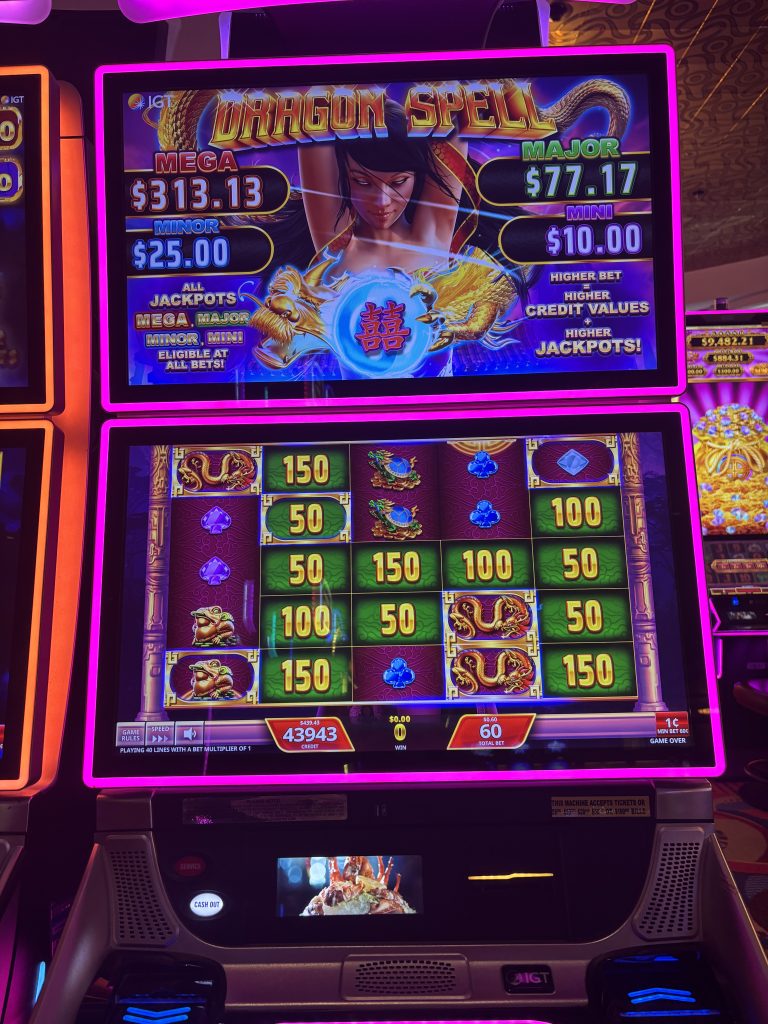 Look for a number in a small blue circle in the bottom-right corner. If there’s a play, you’ll see that same number in the middle of the machine. Spin until you get to zero, which will activate the Dragon Spell feature.