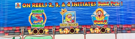 It’s a little hard to read above, but check out the three small graphics above columns two, three, and four: double symbols, king stacks, and bonus. Bonus is the money graphic and in this example, it even comes with one of the two coin slots under it filled. Once that second coin comes, you get a bonus.